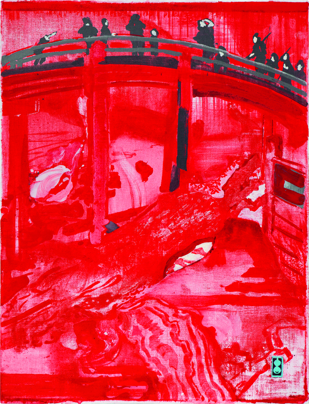 Magdalena Kröner and Noemi Smolik have contributed essays for the exhibition catalog which includes reproductions of all artworks in the show and is available at the gallery. Magdalena Kröner says of the Geomotrie in LD. “the red river, it seems, is to the Maki Na Kamura of “GiL” what the “Red Fuji” was to Katsushika Hokusai, who painted it in forever new variations. Yet color presents the artist with a formal challenge rather than one on the level of representational content: everything that happens in these depictions takes place exclusively in the depths of the red. The bridge across the river with a few figures on it merely constitutes the classical frame for an expressive quest for form, movement, and gesture Na Kamura wrests from the dominance of the monochrome; they transpire afresh, are formulated afresh in each picture.”